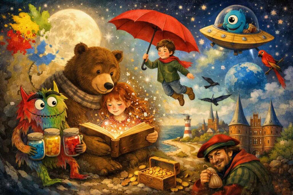 Wir haben die KI aufgefordert, eine Collage aus diesen Büchern zu erstellen und dieses fantasiereiche und bunte Bild ist entstanden: